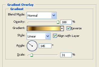 Okay, now name this layer "Pen Tip" and then go visit the "Pen Body Gold" layer, right-click on it and choose Copy Layer Style. Return to the "Pen Tip" one and right-click on it, choose Paste Layer Style. Then get into the Pen Tip’s Blending Styles options, and go to Gradient Overlay. Increase its Gradient’s Scale to 31, like so.