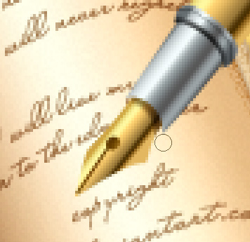 Okay, now let’s take care of the shadow which the pen body casts on the tip. Command/Ctrl + click on the "Pen Tip" and the "Details Pen Tip" layers in the layers palette and get them in a dark blue color, then merge them together. Re-name the layer to "Pen Tip" and then make a new layer above it. Convert this newly-created layer to a clipping mask for our "Pen Tip" one, and set it to Multiply mode. Set your Foreground color to #6a5428 and take up the Brush Tool. Set it to a hard, round, 6-7px in size brush and drag once to create a shadow, like so.