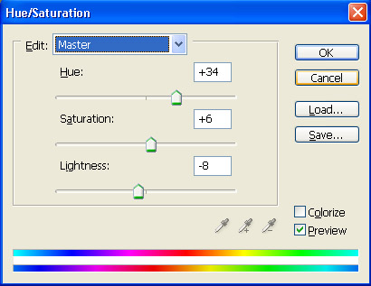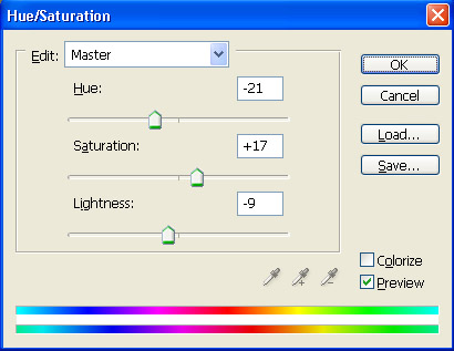 Okay, now you should know we DO have an actual use for this selection, namely this. Go to your Layers Palette, and look at is bottom. Among other icons you’ll notice, you’ll see one that looks like a Yin/Yang symbol, a sort of circle with one white half and one black half, true? Well, that is the "Create new fill or adjustment layer" icon! Okay, make sure you still have that selection we made above, and click on that icon. Choose "Hue/Saturation". And choose these settings.