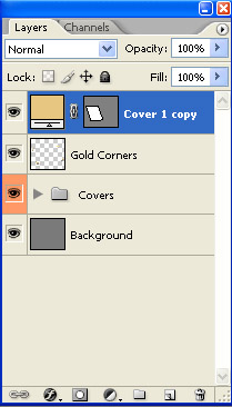 Okay, we’re done with them, name the layer to "Gold Corners", and ta-daa, you’re done with them! Okay now we’ll have to take it slow again, because the next couple of steps are very much intuition-based. Remember those Cover1 & 2 layers? Good! Now go to your Group and duplicate the "Cover 1" shape layer, and move it upwards, outside of your Group. Now, your Layers palette should look something like this.