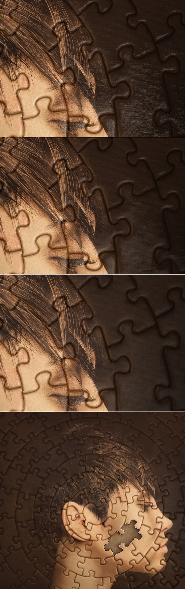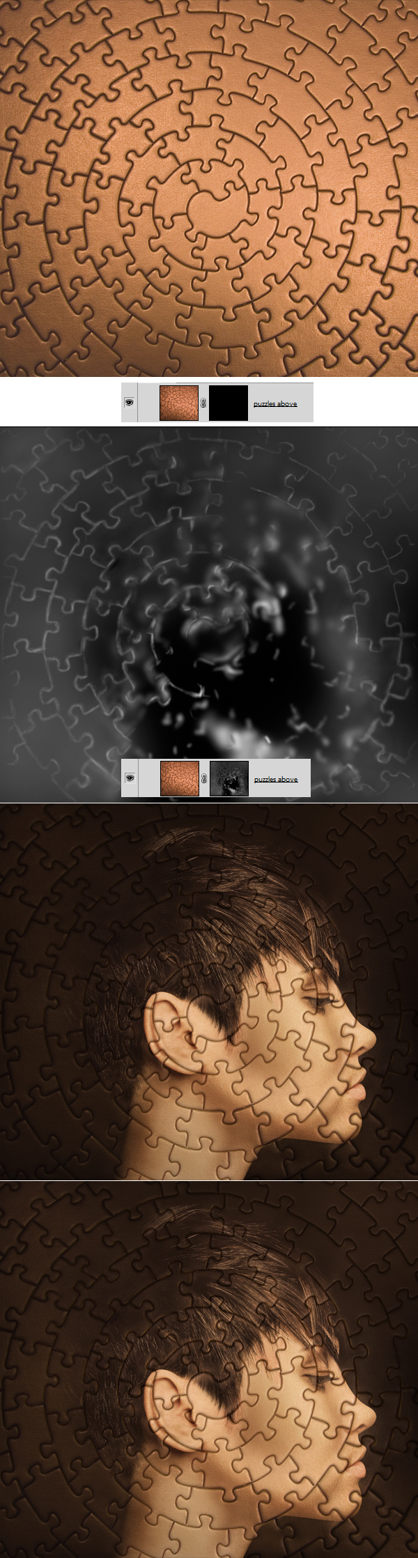 Now we will apply a missing puzzle part. You can use any paper texture that you want. Open it and drag on the top of our Layers Palette. Grab Pen Tool and draw a puzzle shape of your own choice, turn it into selection when you’re done. Hit Command/Ctrl + Shift + I to inverse selection and delete the surrounding texture (3rd image below). It’s good to lower opacity of the paper texture for the time of cutting the puzzle (2nd image below), but remember to bring back the 100% visibility of texture when you’re done with extraction.
