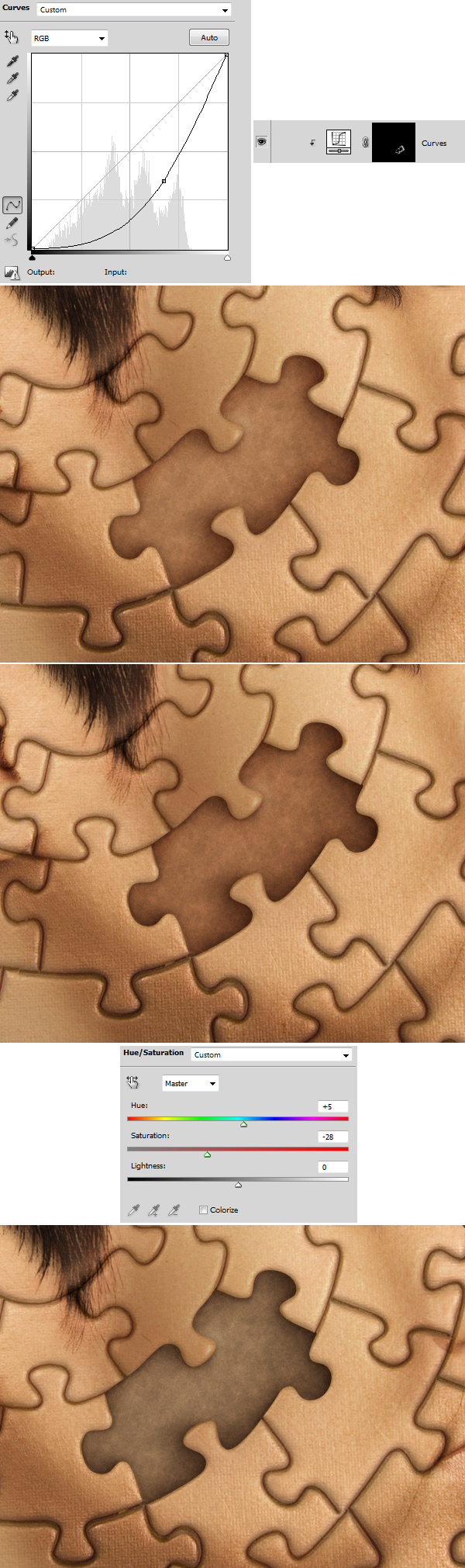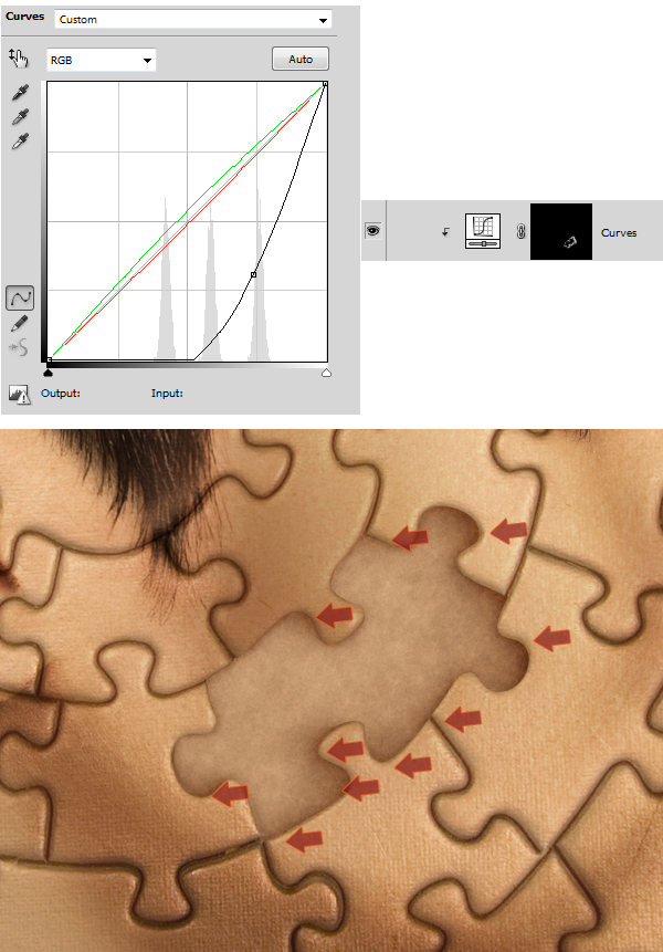 Next thing to do is using the same technique (add Curves > apply Layer > Layer Mask > Hide All > use Clipping Mask) adjust it as you see in the 1st image below. Then paint with white on Layer Mask to enhance shadows in puzzle spaces (2nd image below).