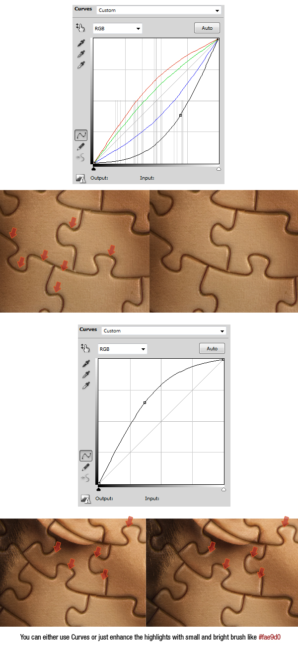 Repeat the same process (add Curves > apply Layer > Layer Mask > Hide All >use Clipping Mask), but this time set the slider to the top left (3rd image below). Then paint with white on Layer Mask to enhance the highlights on puzzle edges (4th image below).