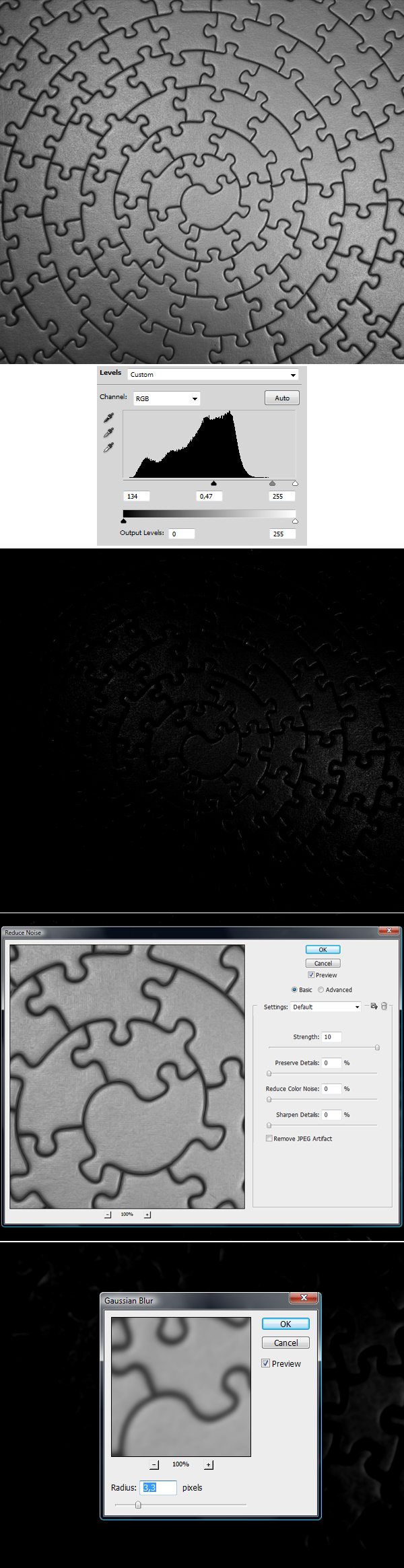Now we will give some nice realism to the image. Duplicate the puzzle layer, name it "puzzle light" and move it on the top of Layers Palette. Next, follow the images below: 1) Desature it using Command/Ctrl + Shift + U. 2) Add Levels adjustment layer (use Clipping Mask) and darken the puzzles to bring out only the hardest light spots. 3) Check if the result is similar to mine. 4) Apply Filter > Noise > Reduce Noise (settings below). 5) Apply Filter > Blur > Gaussian Blur (settings below).