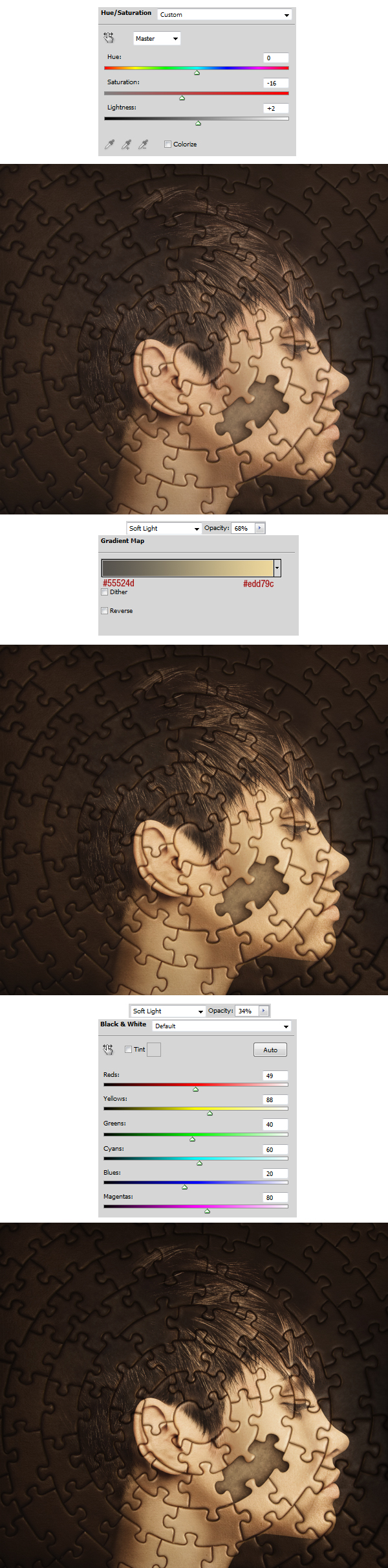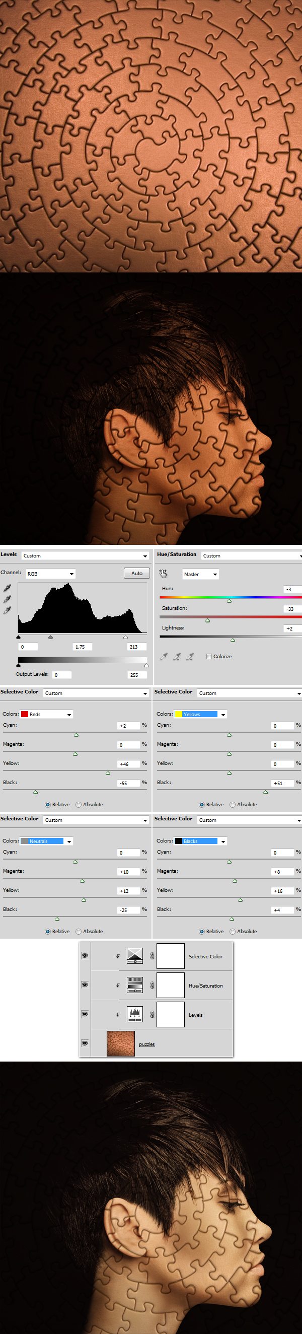 Open the puzzle image, drag it to our main project document and place it properly. Change the puzzle layer’s Blending Mode to Multiply. This layer needs to be on the top of layers palette (don’t use Clipping Mask here). Then, above this layer create: – Levels (settings below) – Hue/Saturation (settings below) – Selective Color (settings below) and now use Clipping Mask for those 3 adjustment layers.