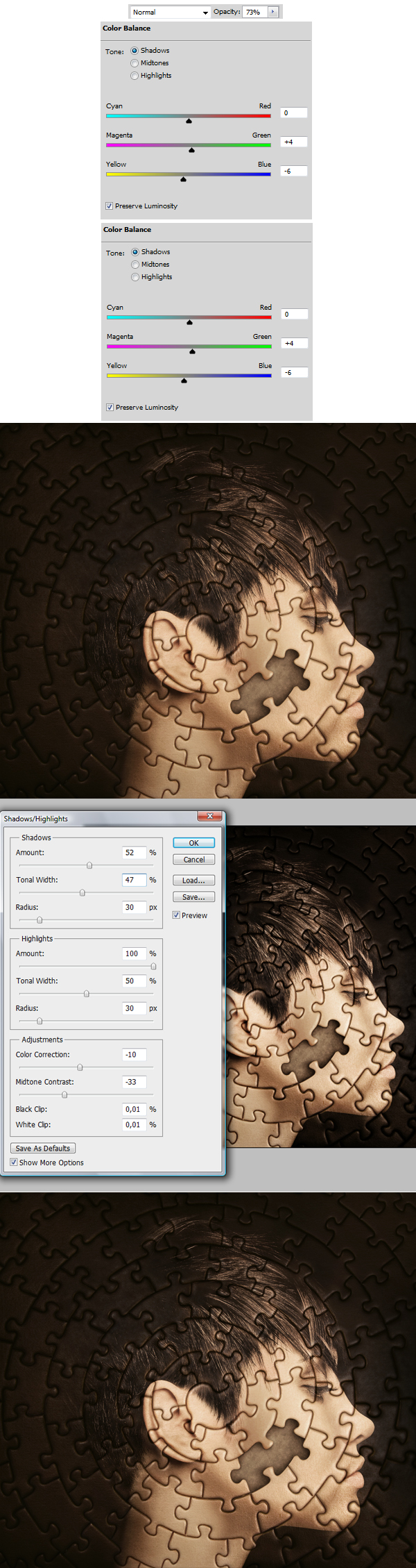 We’re almost done. Now all these final adjustment are done to give even more realistic look. So let’s touch it up with Color Balance (adjustments in 1st-2nd images below, result in 3rd). Then hit Command/Ctrl + Shift + Alt + E to copy/paste whole canvas to new layer, desturate it using Command/Ctrl + Shift + U, change its Blending Mode to Soft Light, then go to Image > Adjustments > Shadows/Highlights then play around with settings (4th image below). The Soft Light Blending Mode will give you live preview of the effect we’re creating right now. When you’re done, it’s good to lower opacity of this layer (to about 30-50%) as the shadows and lights seem to be too fat in full layer visibility.