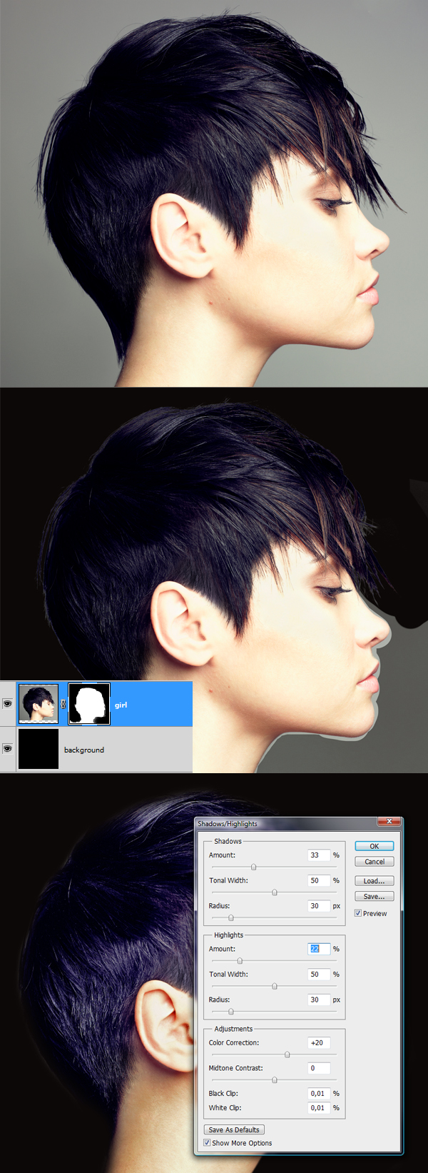 When you’re done select the girl layer and go to Image > Adjustments > Shadows/Highlights and follow the settings from 3rd image below.