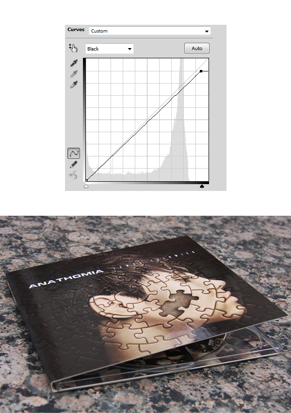 At this point everything depends on your project colors, so it’s kind of personal stuff for adjusting. Anyway to brighten the darkest spots in my cover I just did a slight adjusting of Curves – Black (Alt + 6).