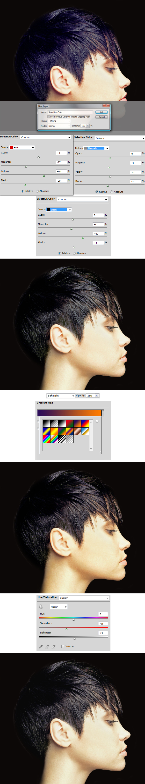 Using this method apply adjustments in order: Selective Color (settings below) > Gradient Map (pick the Violet, Orange preset and use Layer Blending mode of Soft Light with Opacity of 23%) > Hue/Saturation (turn the Saturation slider a little bit down).