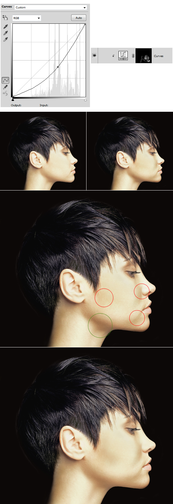 OK, cool. The face is now not so burned. Now let’s enhance the shading. Create a new adjustment layer Curves (using Clipping Mask as previously). Delete its Layer Mask, then go to Layer > Layer Mask > Hide All. In the Curves box pull the slider a little bit to the bottom right (1st image below). Then using a soft, white brush, paint on layer mask in darker spots to enhance shadows.