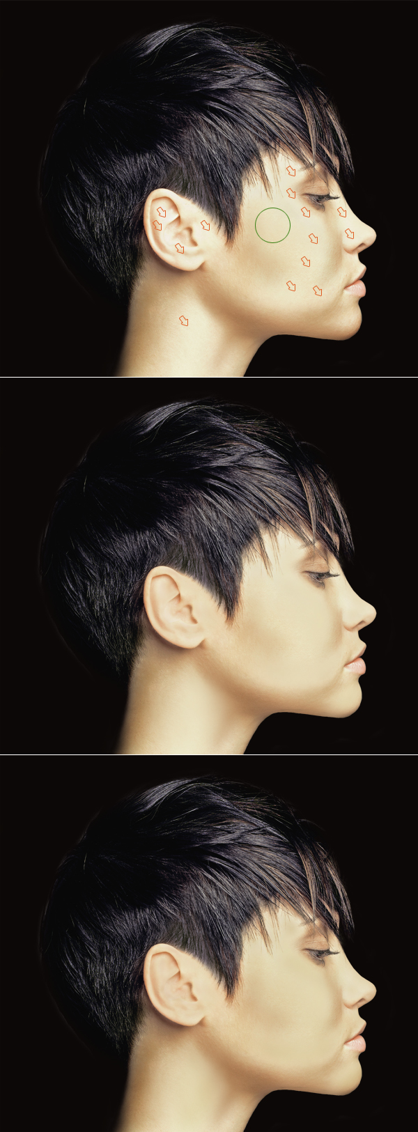 As you can see in the 2nd image below we have covered almost all the whites from her face. If you’re still not satisfied with the result, you can make those spots even more balanced by repeating this process with little bit darker color (3rd image below). It’s easy to overdo that, so be careful.