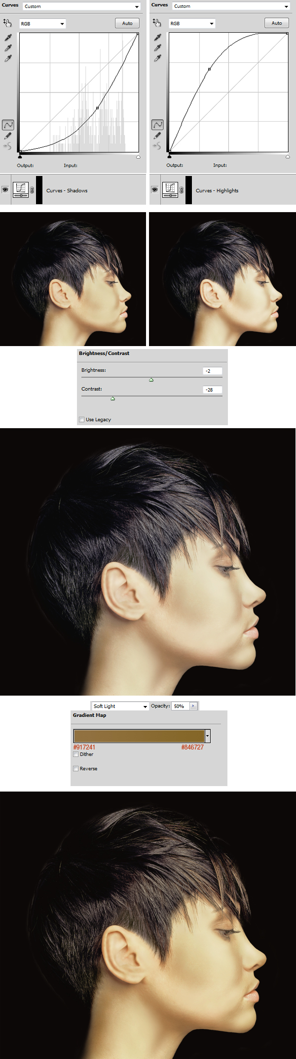 Using the knowledge from previous steps create two new adjustment layers (use Clipping Masks), removed their layer masks and add Layer > Layer Mask > Hide All to both. Pull the sliders as shown below. Then again using very, very soft brush with white color, enhance shadows painting on Curves – Shadows layer mask and then enhance highlights paining on Curves – Highlights layer mask. Second image shows the comparison before/after.
