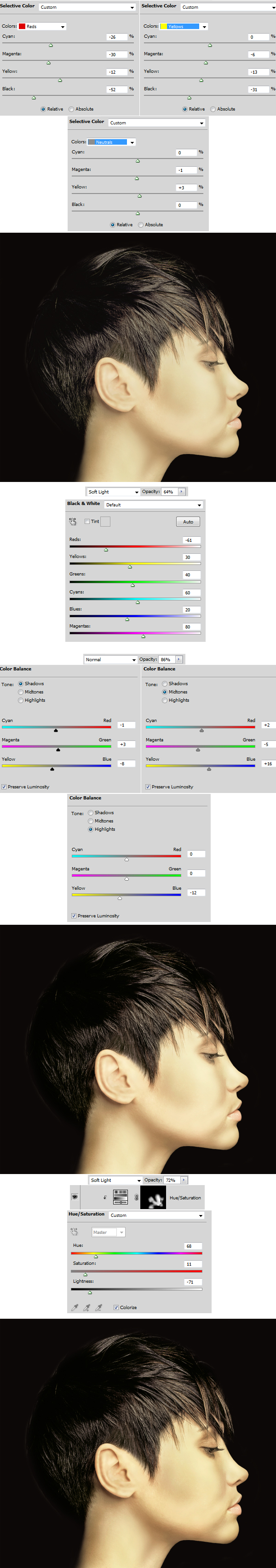 The mass adjustment layering is the result of experimenting. This is necessary when our image has some bad shadows, lights or is just over burned. Now apply Selective Color (settings below), Black & White (settings below), Color Balance (settings below), Hue/Saturation (delete Layer Mask, and apply Layer > Layer Mask > Hide All, use settings below and paint on mask in the highlight face spots).