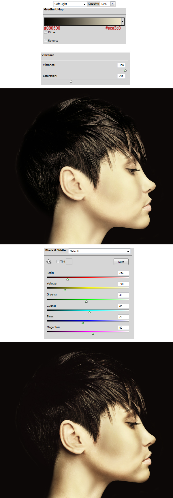 OK, we’re on the right track. After these adjustments we should be done with corrections. Gradient Map (settings below), Vibrance (CS5 option, you can slightly replace it with proper settings of Hue/Saturation), Black & White (use Soft Light Blending Mode and set the values as shown below, also be careful here, this adjustment layer gives pretty high contrast and increases the black and white depth).