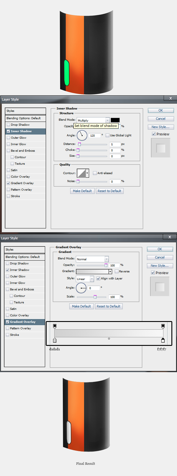 Create a new layer, use pen tool and create the shape described below. After that apply the following layer style.