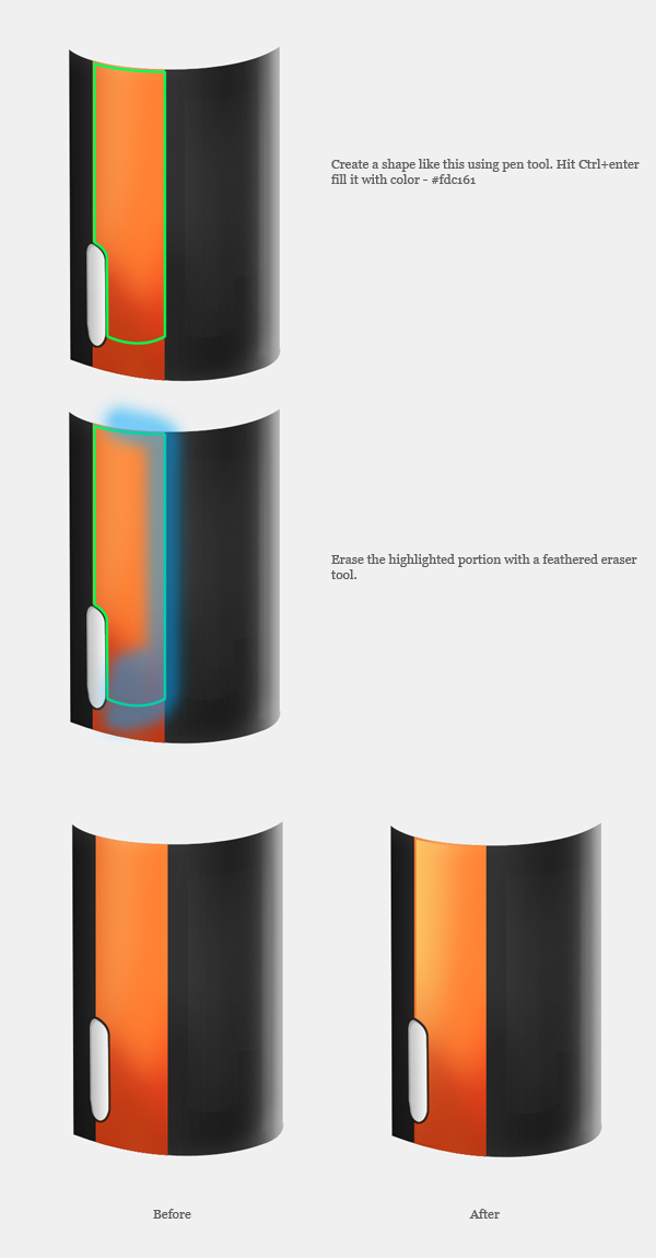 Take Pen tool and create the shape described below. Then hit Command/Ctrl + enter, now fill it with color – #fdc161. Take a feathered eraser tool, then follow the next image.