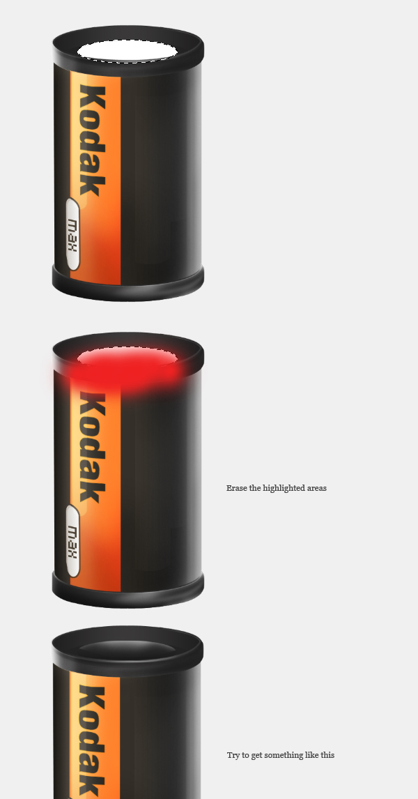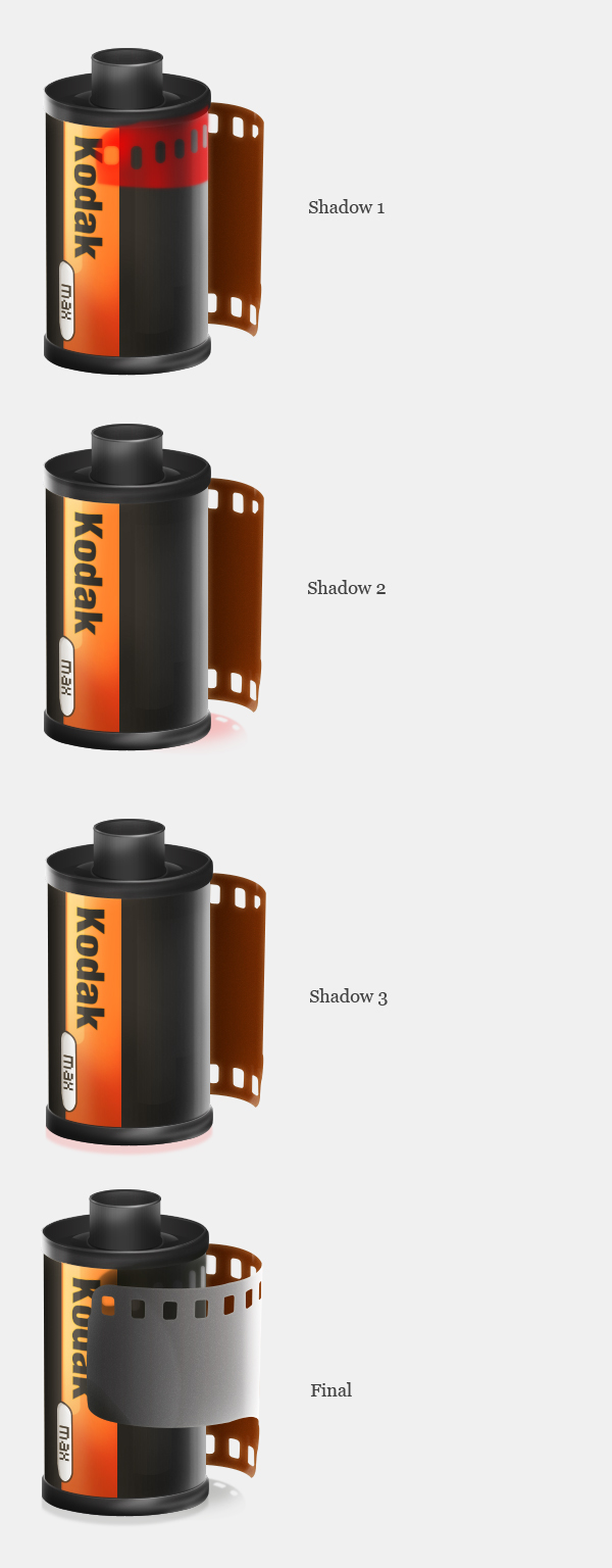 Adding shadows. I created all of the highlighted shapes using pen tool. Fill them with black color. Erase edges of them using a feathered eraser tool. Decrease their opacity. See next image.