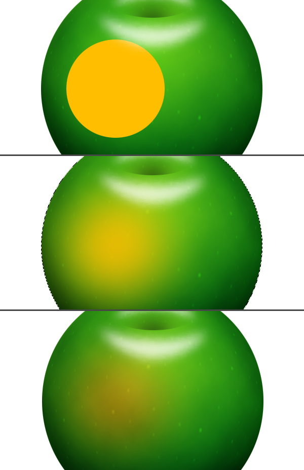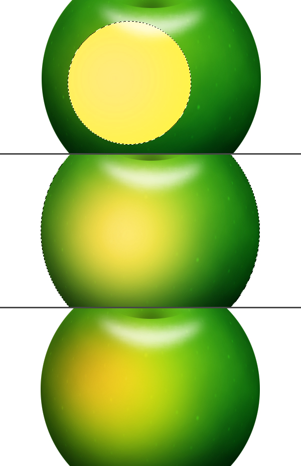 Create a new layer below the "Red" layer, name it "Yellow." Grab the Elliptical Marquee Tool and make a selection as shown, then fill it with the color #fff444. Command-click the "Apple" layer to load the selection. Go to Filter > Blur > Gaussian Blur and apply with a Radius of 50 pixels. Next, set the layer Blending Mode to Hard Light and Opacity at 75%. Deselect by hitting Command + D.