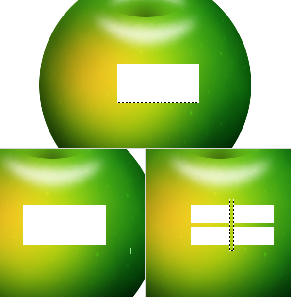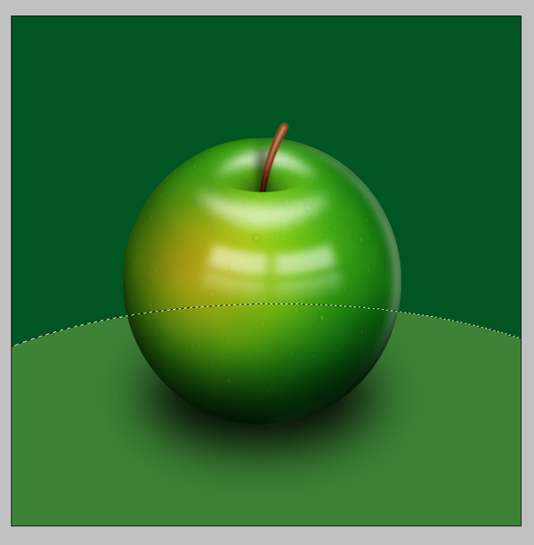 Create a new layer and name it "Apple." Grab the Elliptical Marquee Tool, make a selection as in the below image. Next, grab the Gradient Tool, then pick Foreground to Background and set Style to Radial. Make your Foreground Color #88cc33 and Background Color #005522. Fill the selection as shown.