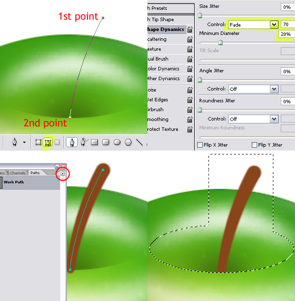 Create a new layer and name it "Stalk." Grab the Pen Tool, set to Paths in the tools options. Draw a curve for the stalk of the apple. Now, grab the Brush Tool and open the Brushes Palette. Under Shape Dynamics, set the Dynamic Control for Size to Fade. Set the Steps for Size Fade to 70 and set Minimum Brush Diameter to 20%. Under Brush Tip Shape, set the Diameter to 14 pixels and Hardness to 100%. Now, set the Foreground Color to #884411.