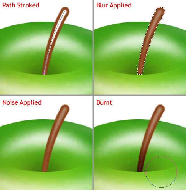 Grab the Burn Tool, and using a soft brush (I set Master Diameter to 65 pixels and Hardness to 0%), make the bottom part of the stalk darker.