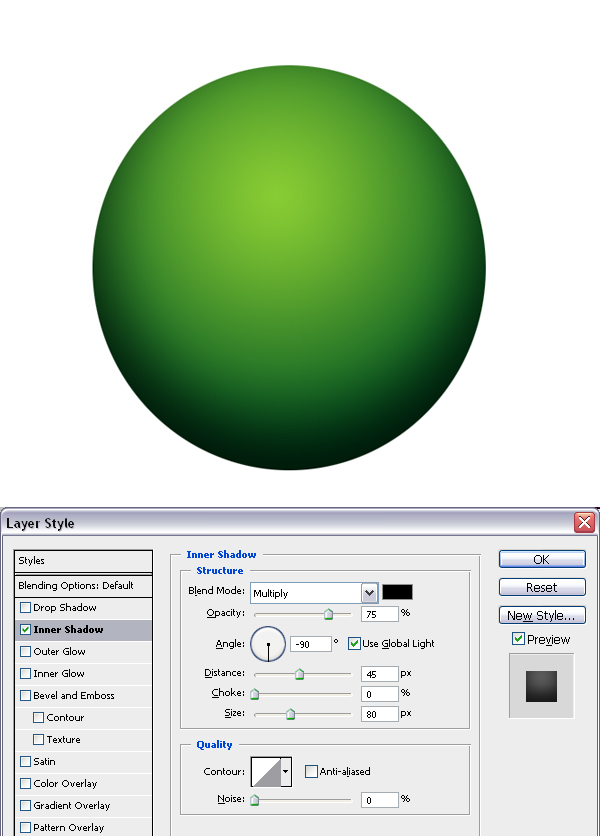 Apply the Inner Shadow layer style using these settings: Blend Mode set to Multiply, Opacity at 75%, Angle set to -90 degrees, Distance set to 45 pixels, and Size set to 80 pixels.