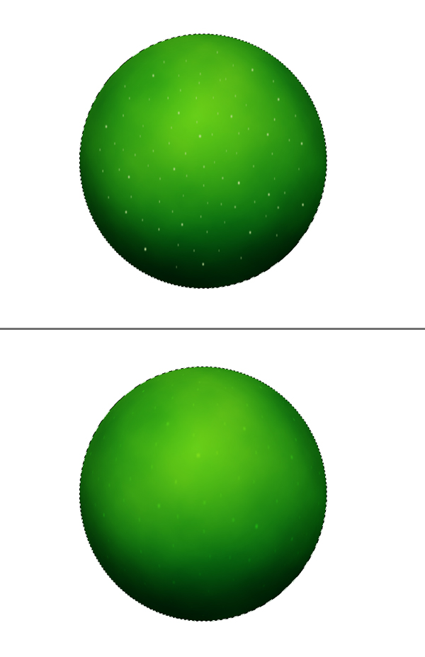 Create a new layer and name it "Texture." Command-click the "Apple" layer to load the selection, if the selection is not still active. Use the colors from step one and go to Filter > Render > Clouds. Next go to Filter > Distort > Spherize, and set the Amount to 100% and Mode to Normal. This will give our simple texture a spheric look. Set the layer Blending Mode to Soft Light. Now we have some texture on the apple.