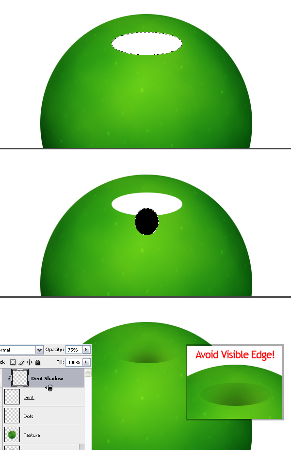 Create a new layer on top and name it "Dent." Grab the Elliptical Marquee Tool and make a selection, as shown in the below image, then fill it with white and Deselect. Create another layer and name this one "Dent Shadow." Make an elliptical selection, as in the image below, and fill it with black.