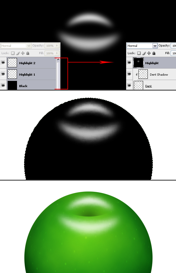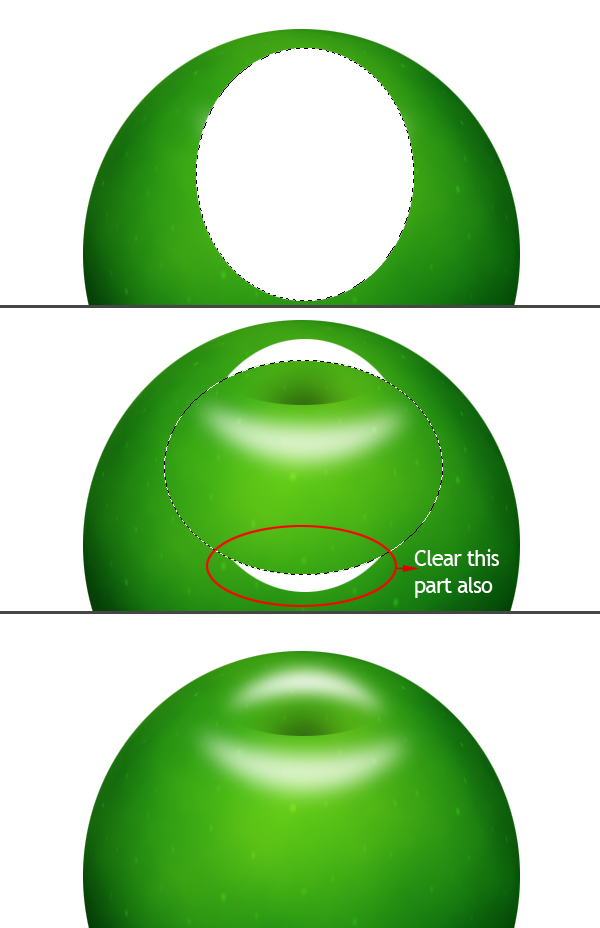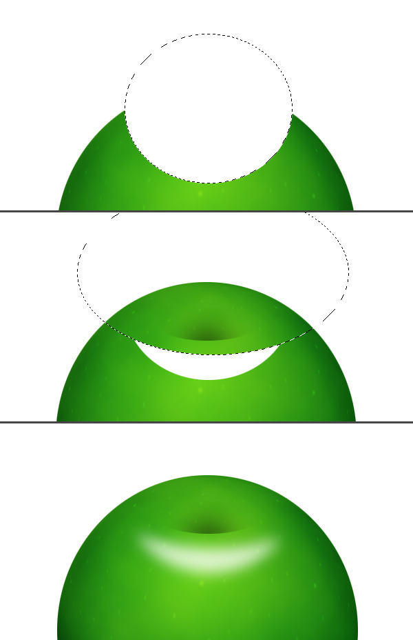 I applied an Inner Glow Layer Style to the "Apple" layer to make the edges a little bit darker using these settings: Blend Mode of Multiply, Opacity set at 30%, Size set to 20 pixels, and Color set to #003300. I also changed the "Apple" layer Inner Shadow Opacity to 45%.