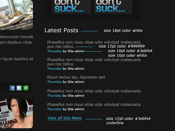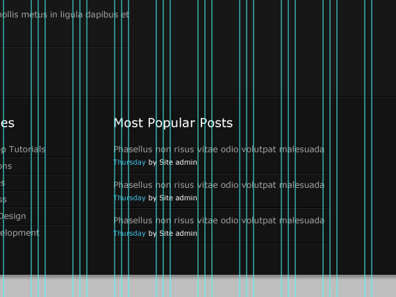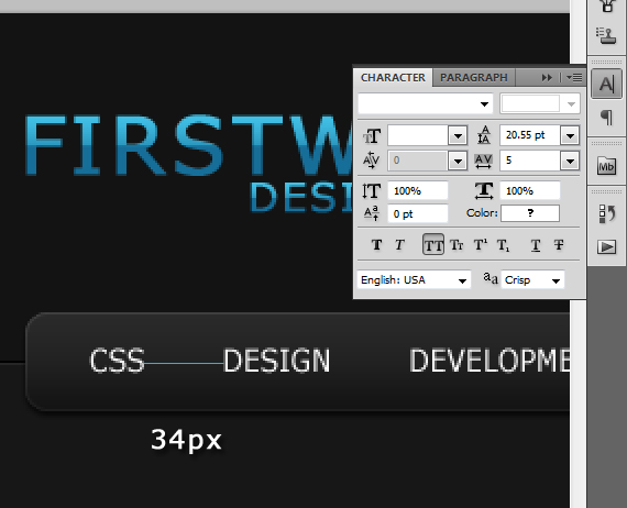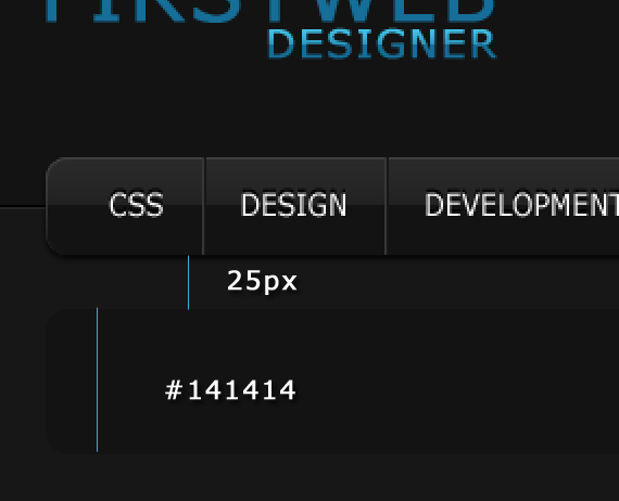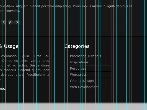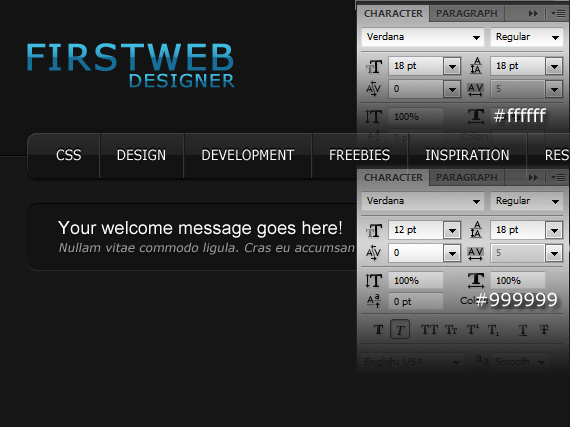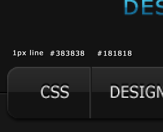 Change text color to #999999. Also right after the text paragraph let’s add two 1px lines and move one on the top so it gets that embedded effect, same as we did to our navigation separators. Color could be #000000 and #2a2a2a.