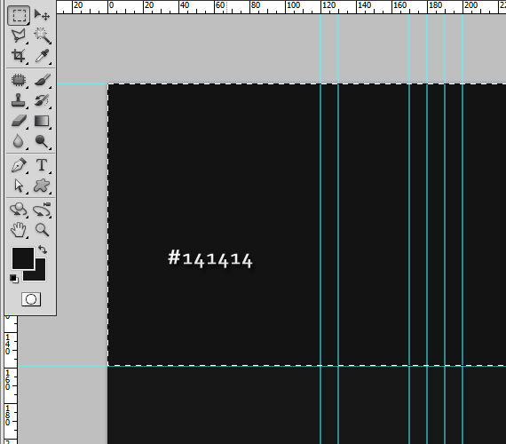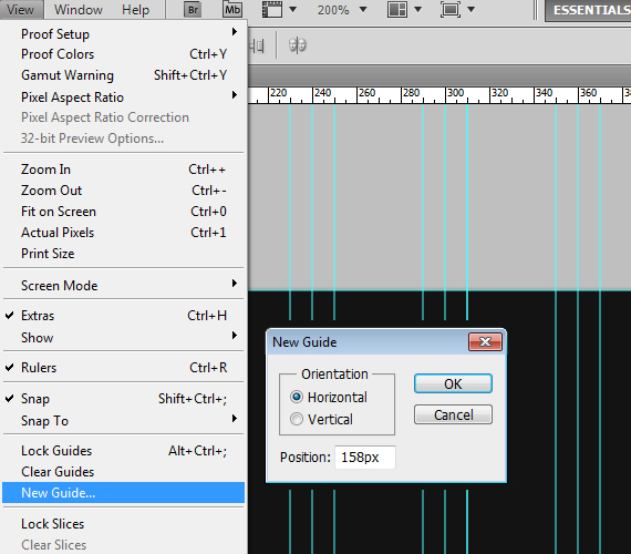 - Create a guideline for our header area. Add it to be 158px from the top. (if you don’t see rulers press CTRL+R).