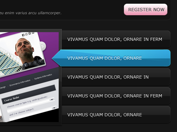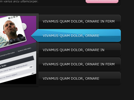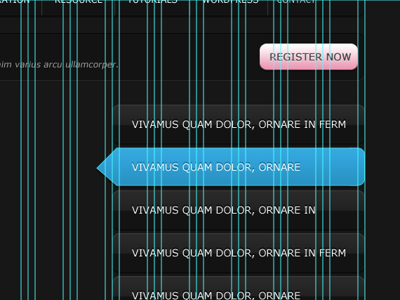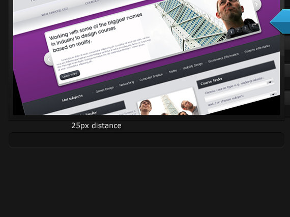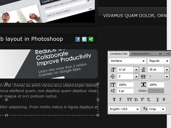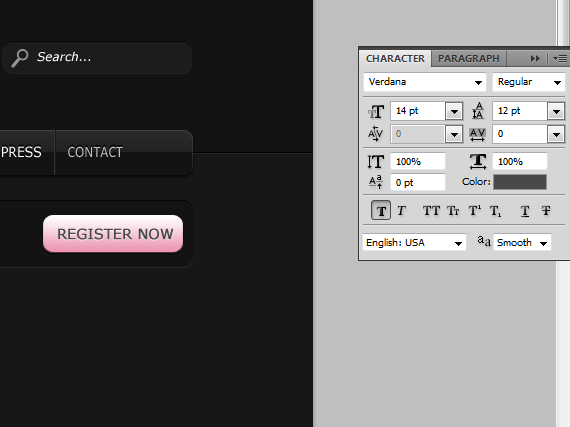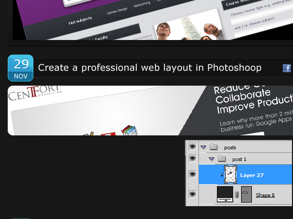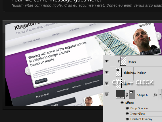 Apply the same style as we did to our navigation before. You can do this by pointing at the fx on the layer hold ALT and drag it to the layer you wanted to apply. (or just right click on layer > Copy Layer Style and paste it on whatever layer you want),