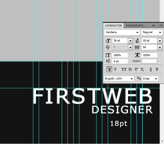 For this example we will make 7 boxes with 5px distance between each other. I labeled it with 1-7 Verdana text, with size: 14px.