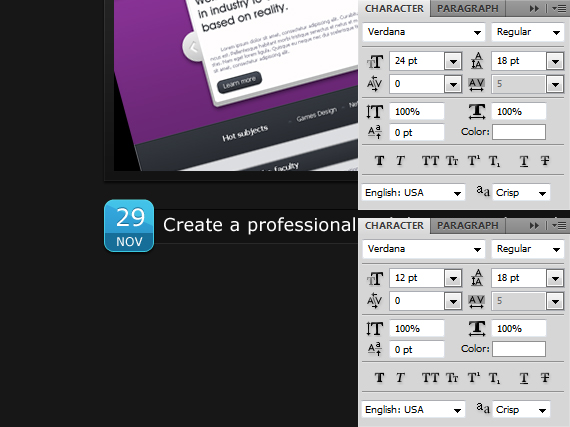 For the text here I used Verdana 14px.