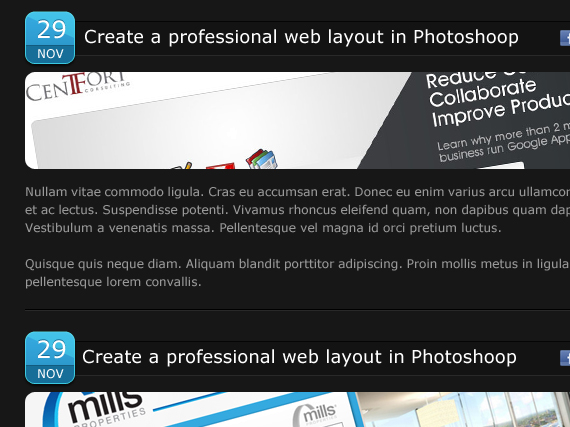 Select Text Tool(T) and put here some dummy text. I used the same font size we had for header an the paragraph text before. Also I grabbed RSS icon from icon set and resized it down to