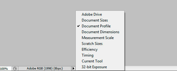 So now that you know how to customize them, you might want to know where to find out what profile is embedded in the file you have opened. You can find that out in the lower left corner of Photoshop. There is a small bar displaying various information, what you want to do, is to click the right arrow and from the menu choose Document Profile, this will display the ICC profile information you seek.