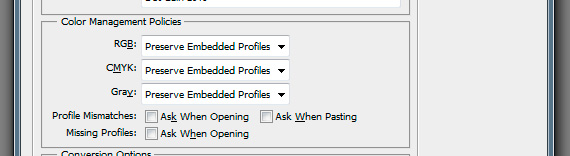 If you choose to turn off the Color Management Policies the files you create will not have the *ICC profiles embedded in them. That may cause your files to vary in color on different displays. It’s generally recommended that you leave it on.