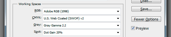 You will want to leave this option here at it’s default place at U.S. Web Coated (SWOP) v2 . If you have the possibility of asking for the CMYK Color Settings file of the printer you will use, do so by all means. With that in mind just choose the “Load CMYK” option from the menu and you’re good to go.