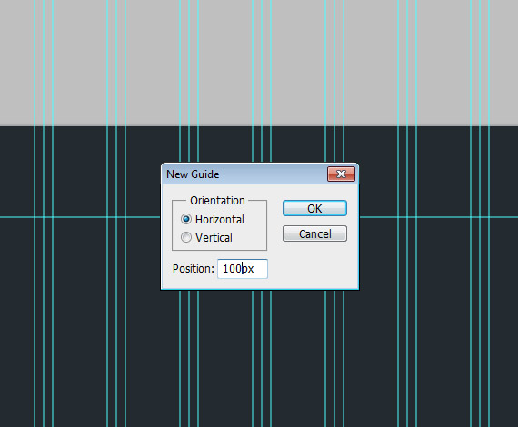 Rename the layer1 folder to Header and rename layer 1 to header_bg (Make sure that you have finished creating the folders as I said earlier). Create a new guideline go to View > New Guide and set the position to 100px, orientation to horizontal.