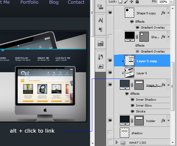 Now grab some of your works to put up in our slideshow image. From the layers panel create a new layer above the image_holder layer and link it together. Follow how I link it in the screenshot.