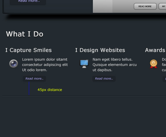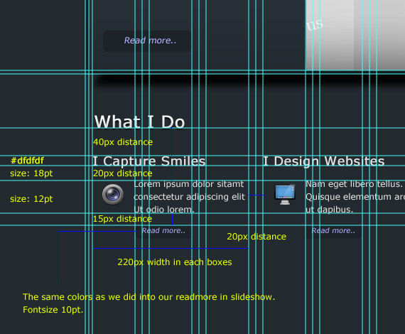 Ready the icons that you have downloaded. We will going to add 4 different folders in our What I Do folder. These are I Capture Smiles, I Design Websites, Awards I Receive and I love to Socialize, these will be on a separate folder.. Now follow how I place the text in the screenshot.