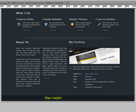 Select the About Me folder , now we are going to add the about me header and information, so select the Text Tool(T) and write text the same ways as in the screenshot. I use the same formatting in text as we id in our What I Do section.