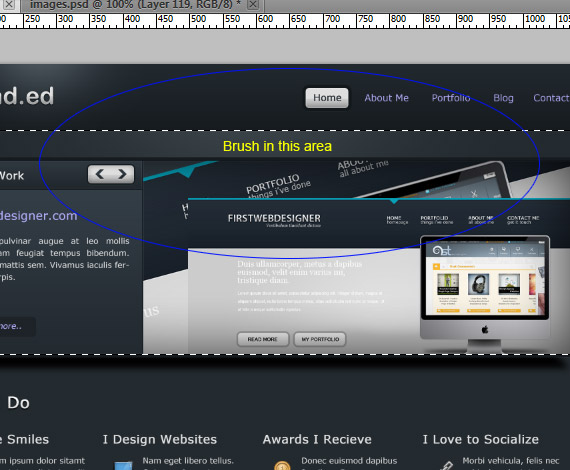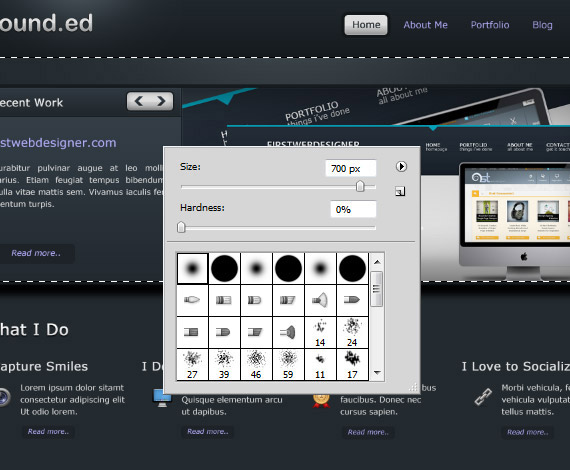 Notice that our background is just flat. In this step we will going to add more brightness in the slide show area and in the middle area. Now Select Background folder, create a 2 layers inside and name it Slideshow_light and the other is whatido_light. Select slideshow_light layer, select Rectangular Marquee Tool and make a selection as shown in the screenshot.