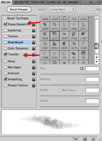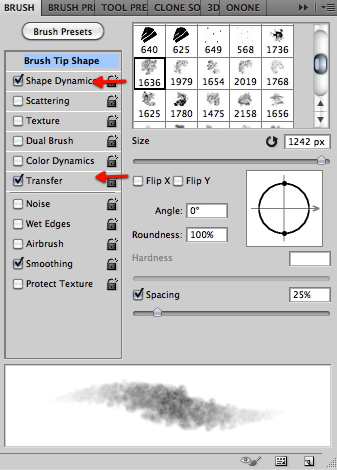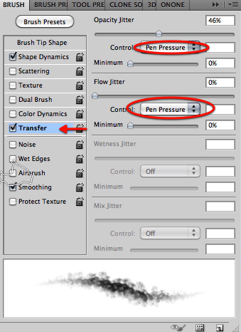 OK now most of the time we wont be using the brushes just as a stamp so we must see how they behave with different options enabled. So check on shape dynamics and transfer in the brush palette with pen pressure control.