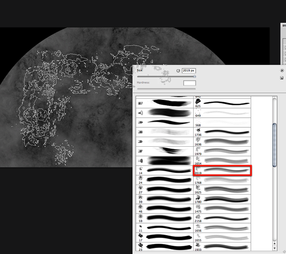 Next on sample a bright orange from the surface and select the custom brush shown below at about 715px