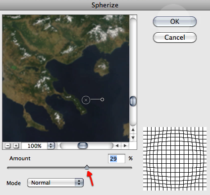Once you have the selection apply the spherize filter twice with the settings shown below.