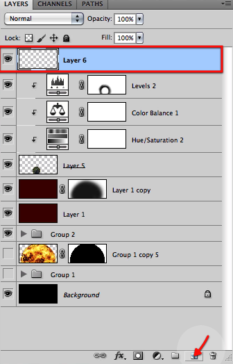 OK grab all the layers we have been working on and make a new group from them as you can see here leaving the hidden layers and the red fill outside.