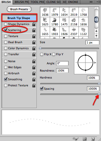 For this we will need a very small defined brush and adjust the settings for it as shown below with scattering enabled and a maximum spacing setting.